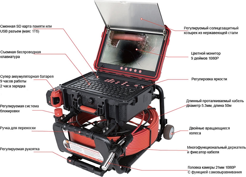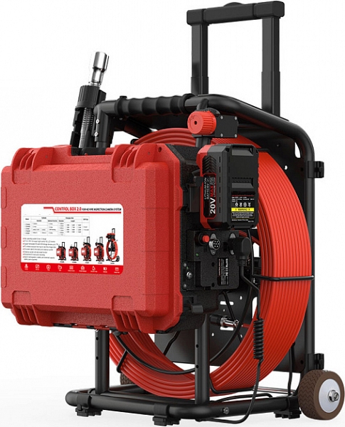 - Головка камеры Ø 29 × 50 мм и проталкиваемый кабель Ø 6,8 мм × 50 м из стекловолокна со счетчиком длины и системой торможения, подходящие для труб Ø 50 – 200 мм, длиной до 50 м